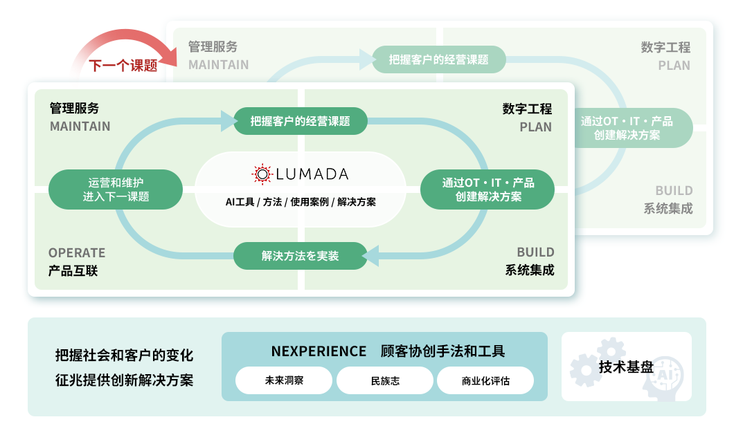 日立研究开发集团基于Lumada构想,以价值创造为原点,着力强化DX/GX(数字化/绿色化)的相关实践。同时,运用日立原创的协创方法论“NEXPERIENCE”,捕捉社会和客户的变化征兆,进而制定愿景、设计商业蓝图。