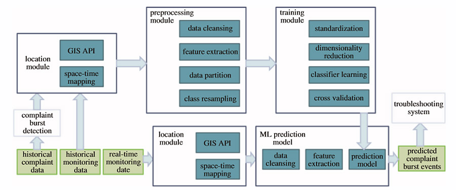 The input data to the system include network-monitoring data and user complaint data. It is necessary to analyze the correlation between them to select the abnormal indicators that have a high probability of being related to the complaint. These selected indicators can be used to establish the model to predict the occurrence of complaints. Before entering a machine learning pipeline, these datasets need to be specially treated with our designed methods including a fuzzy spatial gridding method to combat the inaccuracy in complaint location, filtering complaint burst events to avoid the noise in raw complaint time series, shown in the top-most sub-figure in Fig. 2, and a multi-scale time windowing method to distill temporal features. The prepared data is finally presented in fine matrix form to the ML-pipeline for either offline training or online prediction. The pipeline contains steps for standardization, class resampling, dimensionality reduction as well as a classifier.