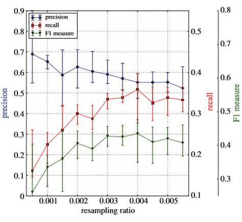 The proposed system is evaluated using real data collected from a major Chinese mobile network operator, where complaint burst events account for only about 0.3% of all recorded events. We find some interesting points. For example, the system performance increases steadily and significantly with the length of target time window, as shown in Fig. 3. A longer time window also makes the system overly pessimistic, it is more practical to set the target time window to a reasonably small length, e.g., 15 hours. Additionally, because burst complaint prediction is an unbalanced classification problem, in the actual deployment, it is necessary to adjust the parameter configuration of the prediction model according to the actual needs, such as the cost of false alarm and the cost of the miss alarm. Fig. 4 shows the precision and recall value as we increase the ratio between the number of positive and negative samples after resampling.