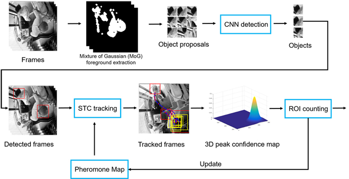 2 June 2020Currently, public transportation vehicles, such as buses, are equipped with many on-board cameras mainly for security purposes. If automatic passenger flow estimation can be realized using existing on-board cameras, the efficiency of public transportation services can be improved by optimizing the route plan and traffic schedule, thus benefitting public transportation system operation. To realize this purpose, we designed a passenger counting system based on the spatial-temporal context (STC) tracking (space and time tracking) and the convolutional neural network (CNN) detection (image-based object detection). Meanwhile, inspired by the movement of ants in nature, we explored the movement information to build a biologically inspired pheromone map (an insect’s location mechanism by secreted chemical materials) to enhance counting robustness. The experimental results we obtained on a real public bus transportation dataset showed that this method outperforms some existing methods.