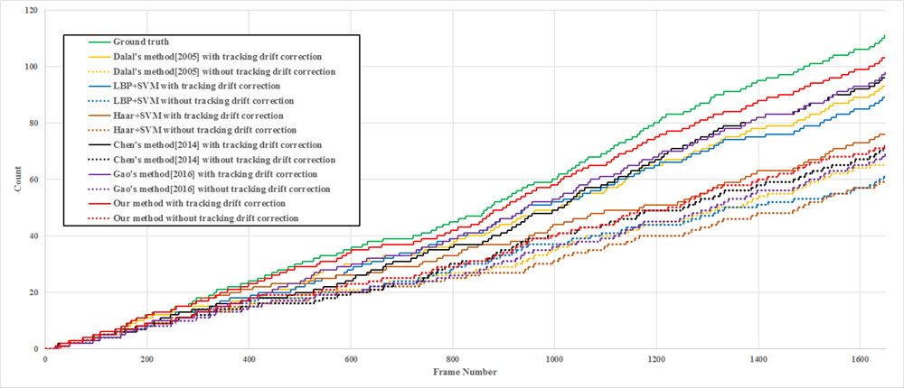 The dataset is collected from real surveillance video of the public bus transportation in China. Our method is applied to determine the passenger flow in a bus transportation scene. Ground-truth was built by manually counting the passengers getting on/off the bus in surveillance video. To quantitatively evaluate the performance of our method compared with other methods, we applied six algorithms to 12 video clips in real bus transportation scenes, as shown in Figure 3. We also compared the results with/without tracking drift (a cumulative tracking error) correction by the biologically inspired pheromone map module in Figure 3. The results showed that our method realizes a higher accuracy of 64.66% without tracking drift correction. The results were further enhanced when tracking drift correction was applied, achieving an even higher accuracy of 93.10%.