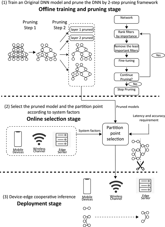 The recommended framework contains three stages: offline training and pruning stage, online selection stage and deployment stage. In the 1st stage, two pruning steps are carried out, where pruning takes place in each entire layer in the whole network and restricts the action ranges for each layer. In the 2nd stage, a partition point is selected according to the restriction of latency-accuracy constraint. In the 3rd stage the computation is divided for mobile devices and edge servers.