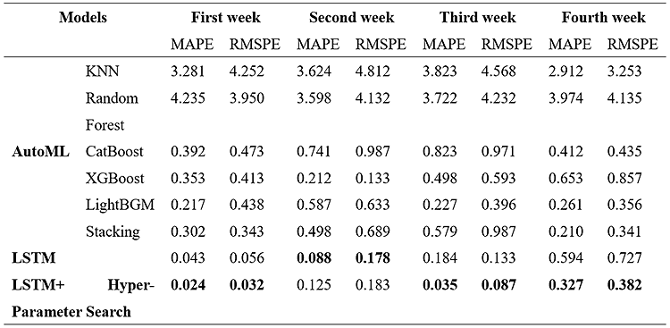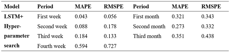- Compared with the ordinary LSTM model, the prediction results for the first, third, and fourth weeks were significantly improved by adding a hyper-parameter search. The lowest (best!) root mean square error (RMSE) and root mean squared percentage error (RMSPE) results are seen in the first-week prediction. Both MAPE and RSMPE for our design (LSTM + hyper-parameter search) showed an improvement of 79% and 75%, respectively, compared to when we only applied the LSTM model.