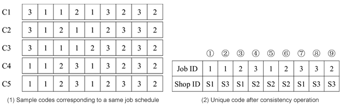 Through novel construction, we proposed an algorithm using a new coding method named “consistency operation in genetics.” In the proposed algorithm, the crossover and mutation operation will generate many new abundant child codes from parent codes. More importantly, the consistency operation uses a 2-layer combination code of process-shop sequence and performs consistent coding according to the consistent coding rules. According to the rules, a series of position exchanges in a code are performed on the job segment to obtain a new code. All codes corresponding to the same job schedule can be transformed into a unique code. In this way, during the operation of the algorithm, for any job schedule, only one analysis and algorithm calculation are performed. With consistency operation, all codes corresponding to the same job schedule can be transformed into a unique code according to the operation rules. The novel algorithm transforming all codes corresponding to the same job schedule into a unique code, which will largely decrease repeated encoding and decoding calculation, will save a lot of time during algorithm operation.